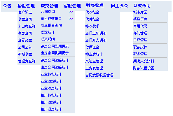 系统目标 ◆融汇房源、客源、销售、财务、客服、办公、预警、DSS等核心业务流程; ◆独有数据防拷贝加密技术,信息安全性与时效性相结合、功能全面性与操作简便性相结合; ◆财务与业务紧密关联,能提供各种数据报表; ◆将公司高层管理思想融合到本系统中; ◆有效的DSS,给高层决策提供有效支持。
