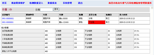 统计某一天的检测记录,显示燃油种类、车型、车牌、检测次数、是否合格、检测员、录入时间;统计当日检测总数、合格数、不合格数、合格率,大车检测总数、合格数、不合格数、合格率, 小车检测总数、合格数、不合格数、合格率, 汽油检测总数、合格数、不合格数、合格率,柴油检测总数、合格数、不合格数、合格率,复检二次不合格数。